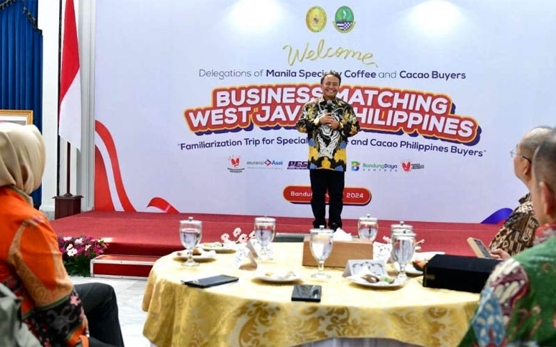 Salah satu upayanya yaitu memfasilitasi pertemuan antara pelaku usaha kopi dan kakao Jabar dengan para pembeli (buyers) dari Filipina melalui pertemuan bisnis (business matching), di Aula Barat Gedung Sate, Kota Bandung, Selasa (9/7/2024).