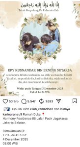 Karina Ranau juga membagikan informasi bahwa rumah duka Epy Kusnandar berada di Harmony Residence 88 Jalan Pasir Jagakarsa Jakarta Selatan.