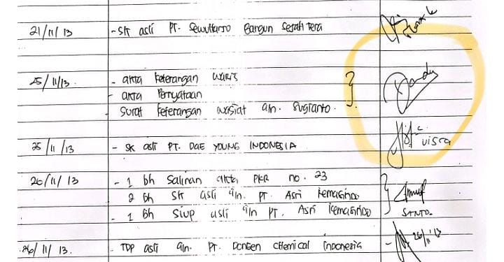 Bukti otentik berupa kehadiran Dandy dan Ferline di kantor Notaris Raden Kania Nursanti selaku pembuat SKW dan akta perubahan pemegang saham PT EMKL Bimajaya Mustika tersebar di kalangan media.