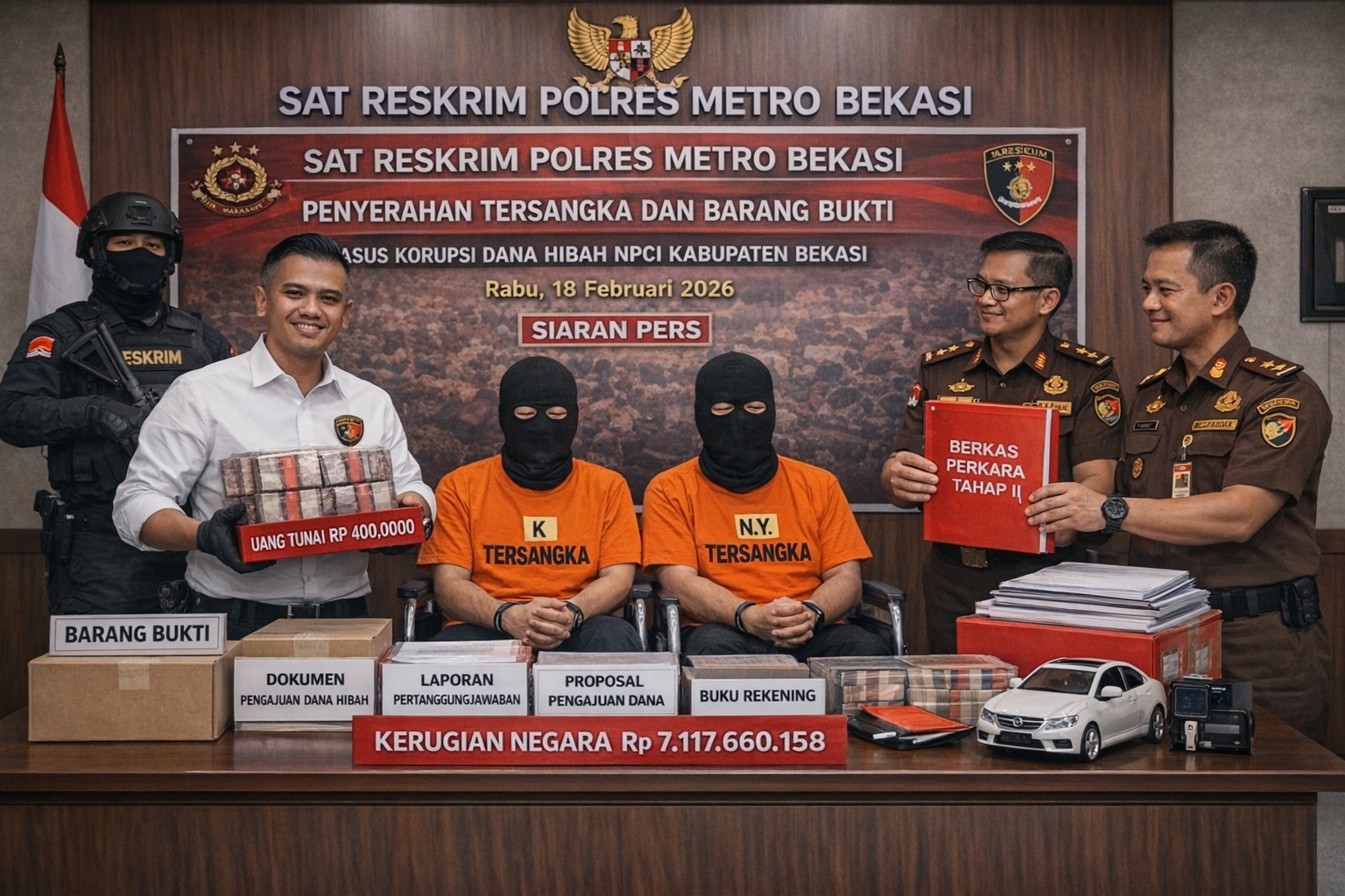 Penyerahan Tahap II dilakukan pada Rabu (18/2/2026) di Ruang Pidsus Kejaksaan Negeri Kabupaten Bekasi setelah berkas perkara dinyatakan lengkap (P-21) oleh Jaksa Penuntut Umum. Dalam kegiatan tersebut, penyidik menyerahkan dua tersangka masing-masing berinisial K (49) dan N.Y. (52) beserta 36 item barang bukti yang berkaitan dengan dugaan penyalahgunaan dana hibah.