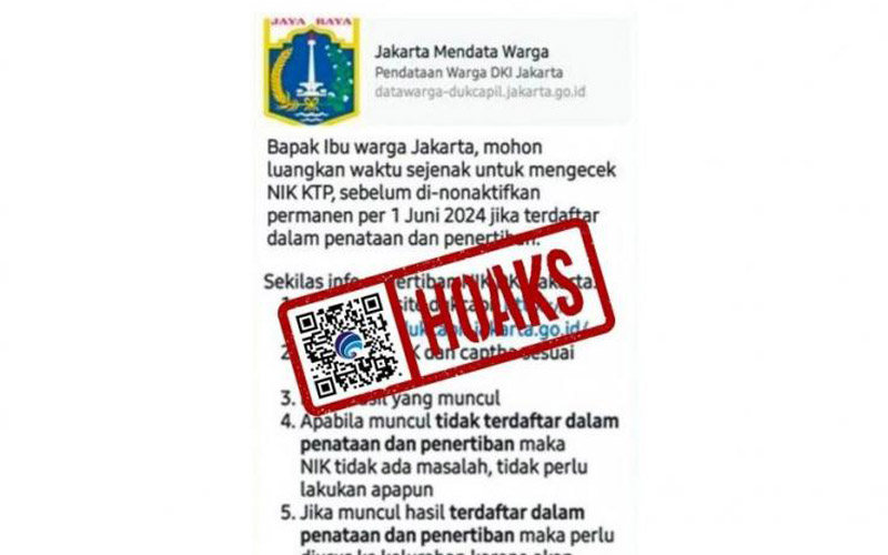Hasil penelusuran Tim AIS Kementerian Komunikasi dan Informatika menemukan fakta, bahwa informasi nonaktif NIK KTP DKJ per tanggal 1 Juni 2024 adalah hoaks.